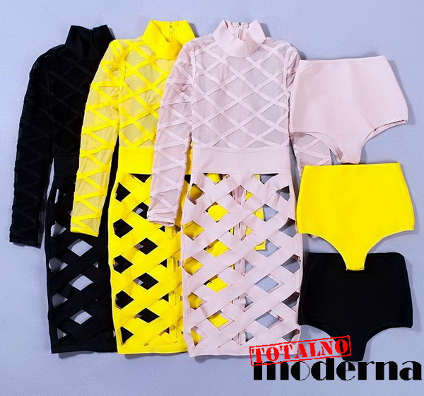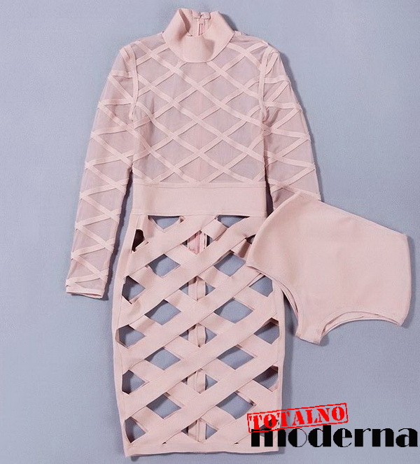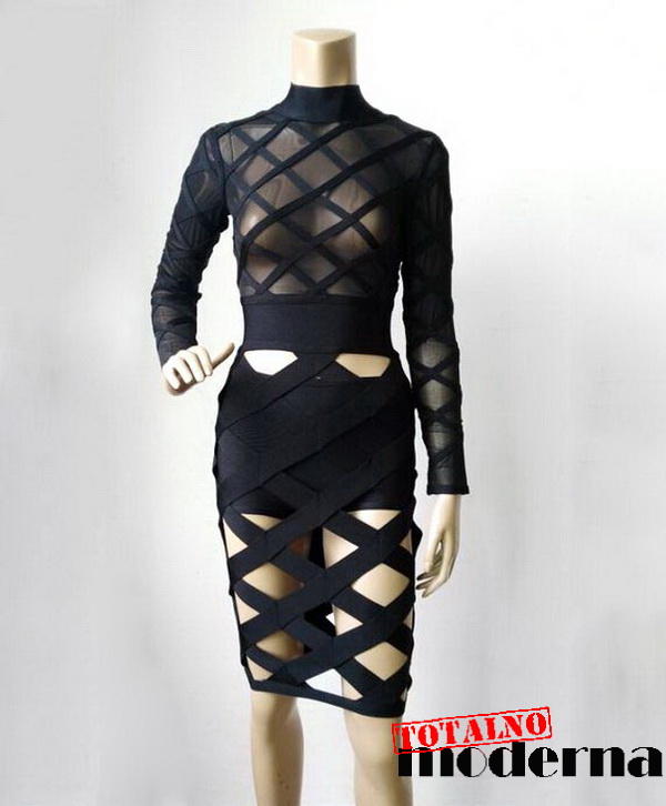 Izazovni komplet Herve Leger haljina i duboke,uske bokserice koje idu ispod haljine koja je sečena i providna u kvadratima.