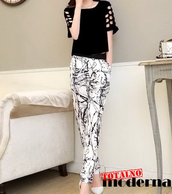Pantalone su sa belom osnovom i crnim polukružnim linijama,crnim rubom oko pojasa i džepova.