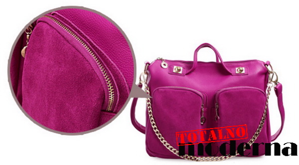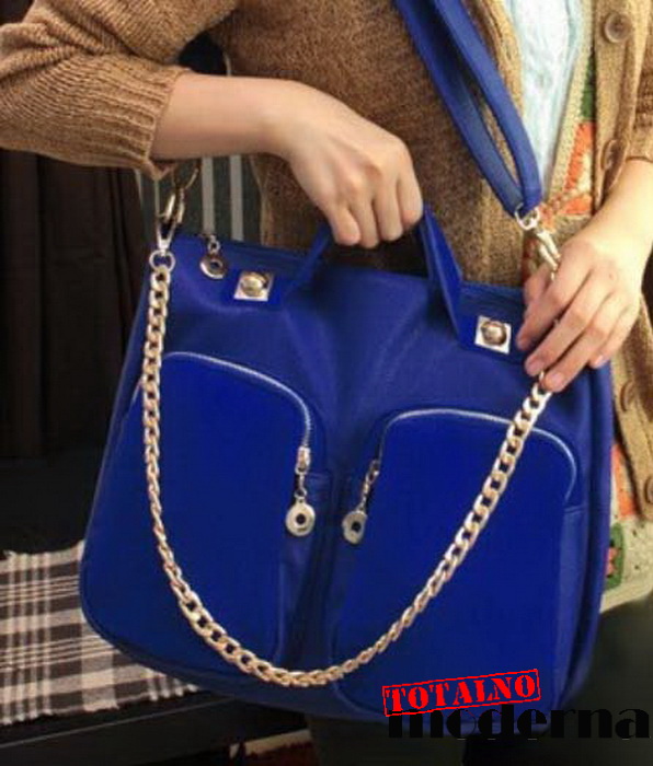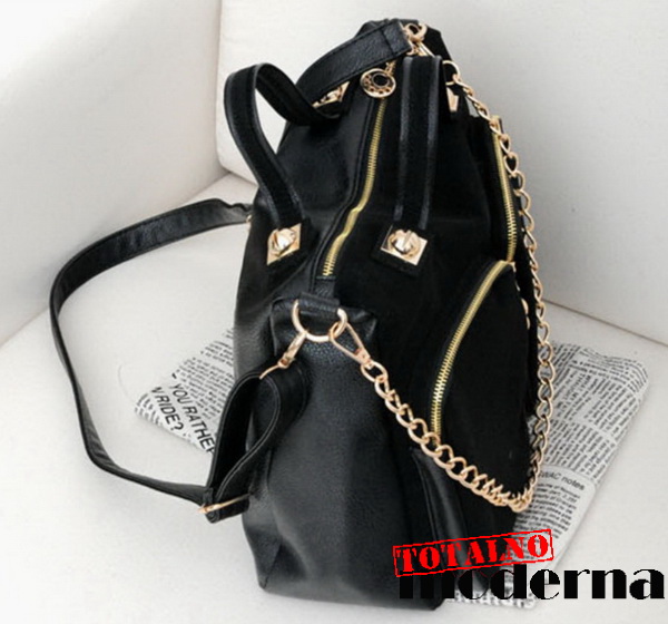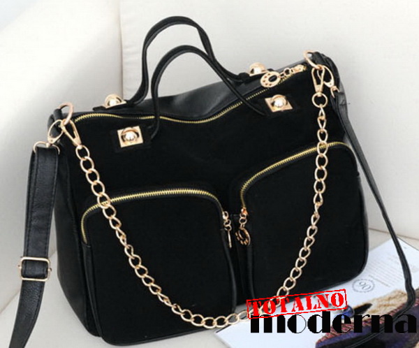 Tašne za svaku priliku , kombinacija prave i veštačke kože sa dva džepa sa prednje strane sa zipovima,zlatnim detaljem u vidu lanca,drškama za ručno držanje i dugim kaišem za rame.